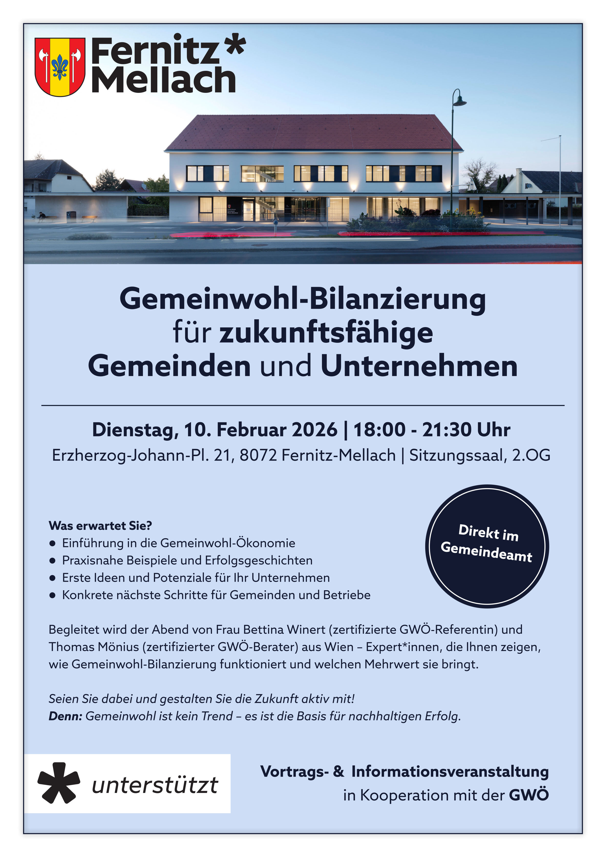 Am Dienstag, den 10. Februar 2026 öffnet die Gemeinde Fernitz-Mellach ihre Türen für einen besonderen Abend "Gemeinwohl-Bilanzierung für zukunftsfähige Gemeinden und Unternehmen“.