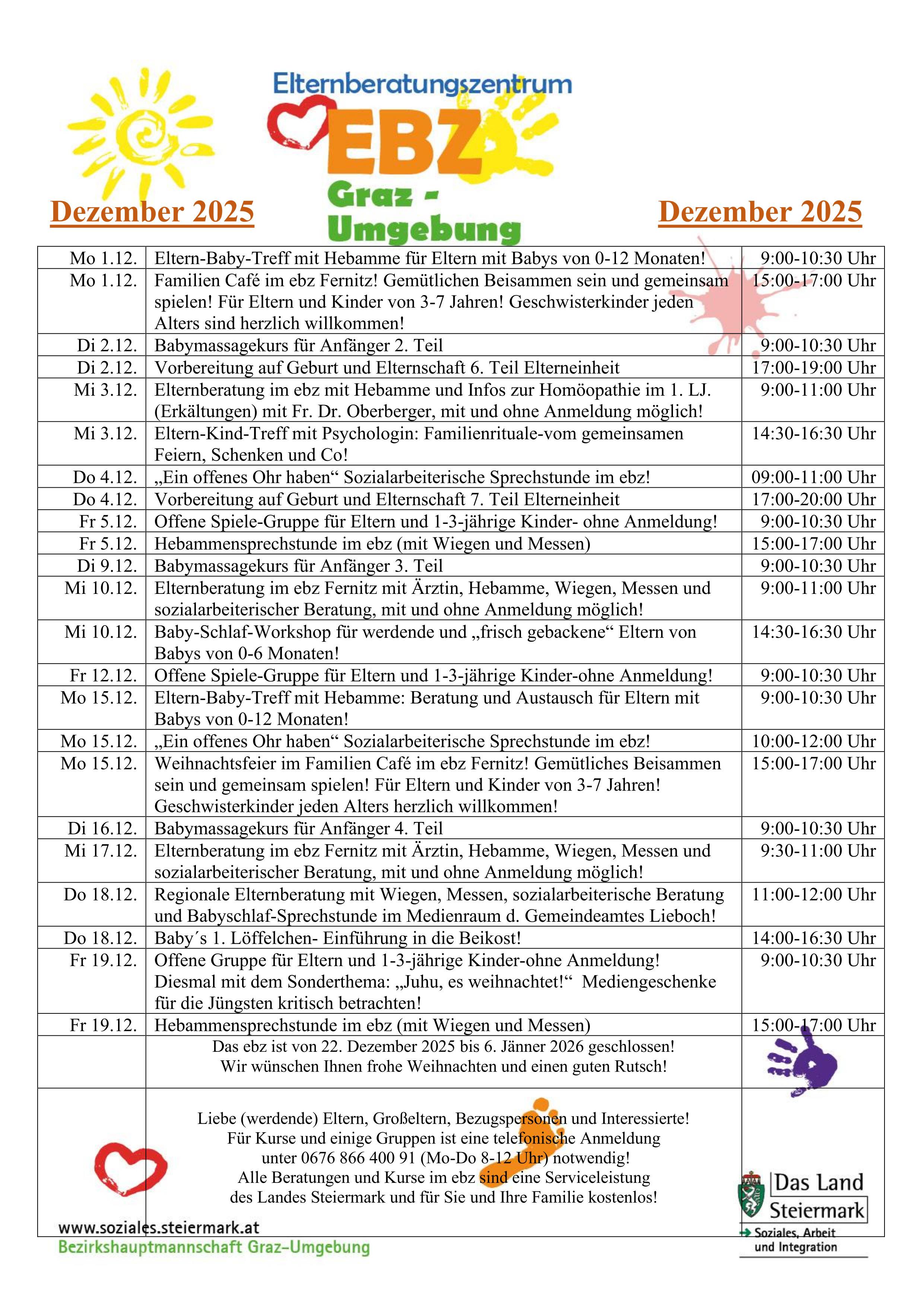 Eltern-Kindtreffen (Baby/Kleinkind), Stillberatung, Ernährungsberatung, Ärztliche Untersuchung und Entwicklungsbeobachtung, Wiegen und Messen, Informationen und Beratung zur Babypflege sowie Elternbildung.