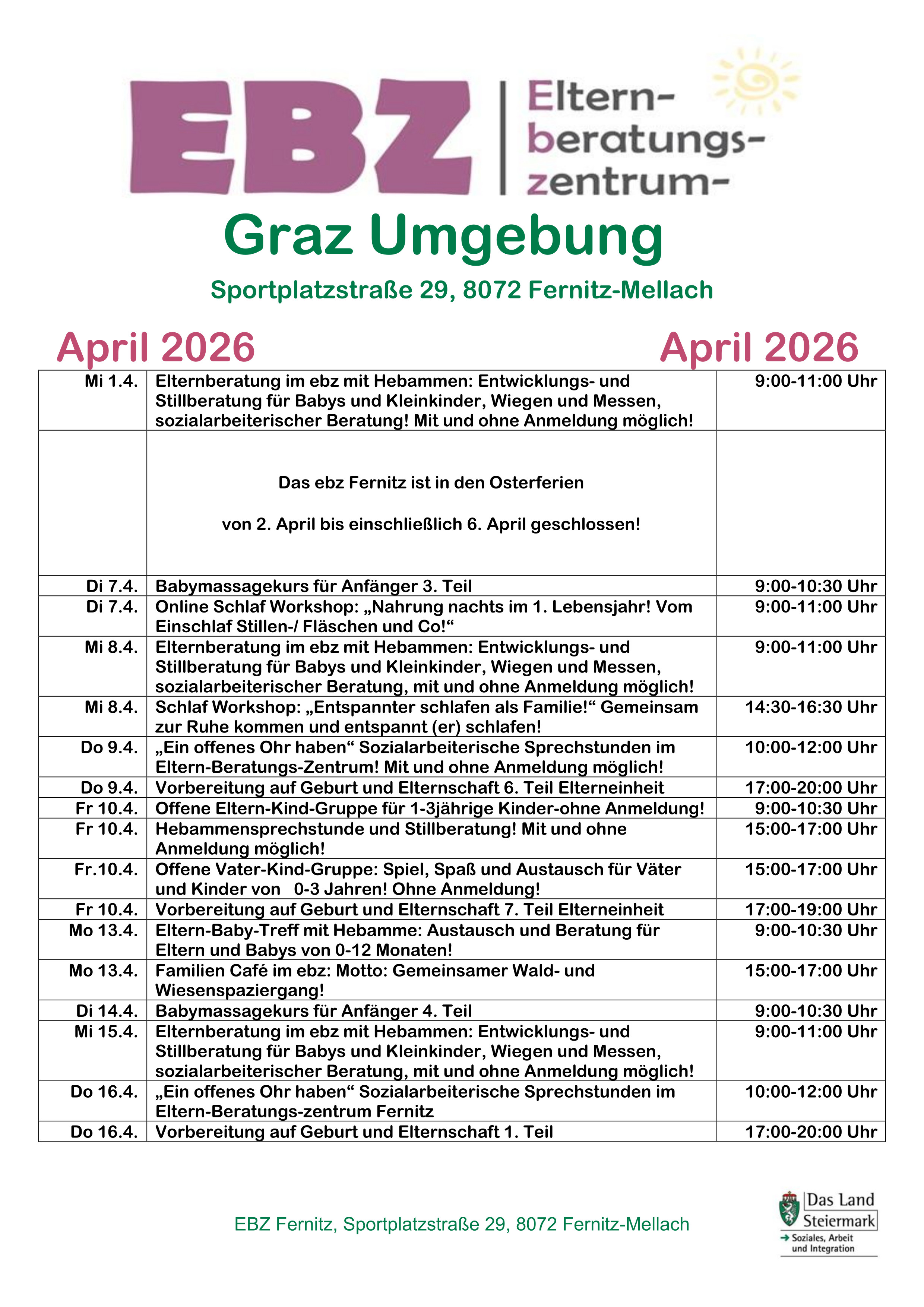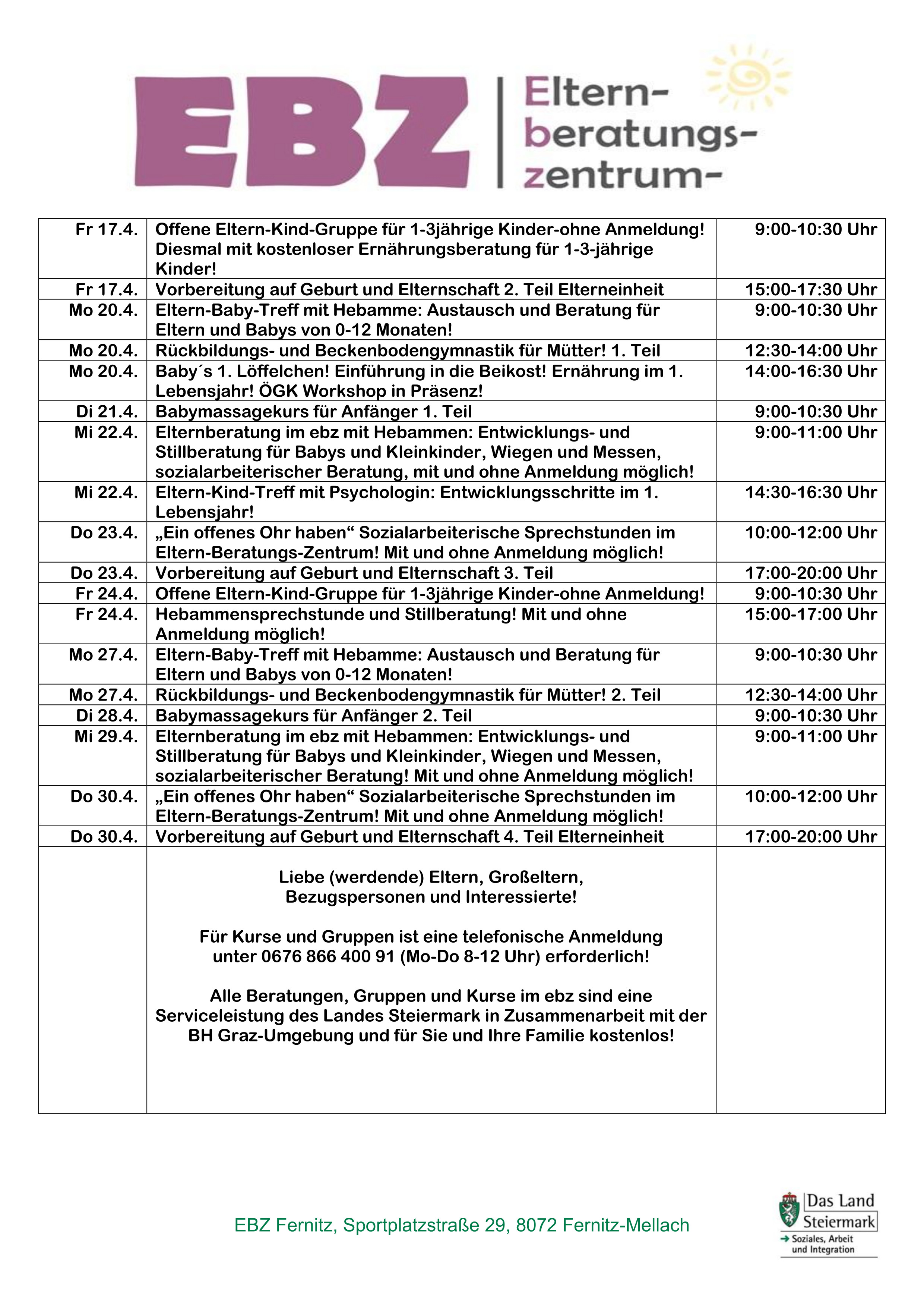 Anmeldungen für April 2026 können ab Montag dem 16. März 8 Uhr telefonisch entgegen genommen werden!
