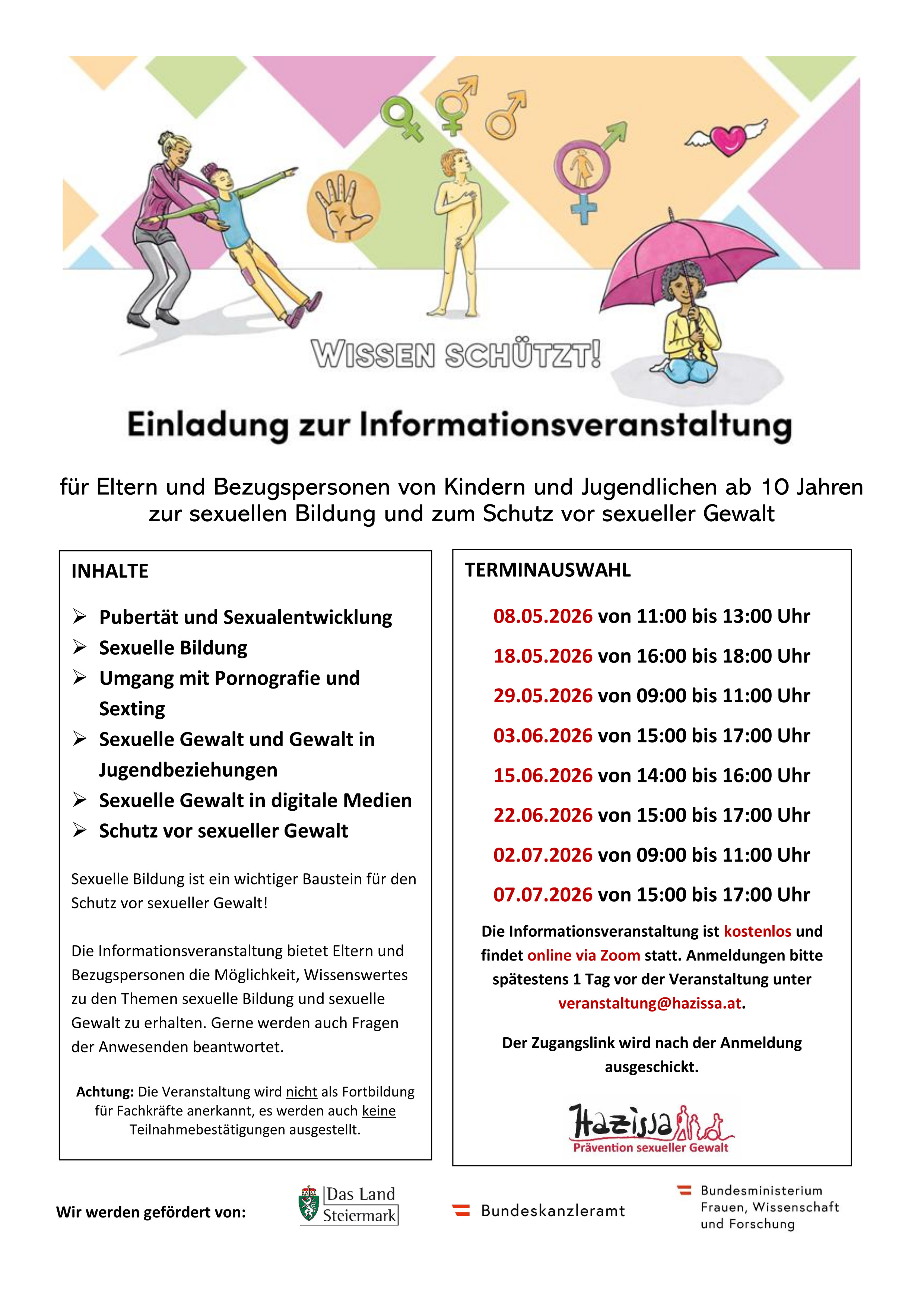 Sexuelle Bildung stärkt Kinder und Jugendliche und ist ein wichtiger Schutzfaktor vor sexueller Gewalt. In dieser kostenlosen Online-Veranstaltung wird über Pubertät und Sexualentwicklung, Pornografie und Sexting, sexueller Gewalt – auch im digitalen Raum – sowie zu Schutzmöglichkeiten informiert.