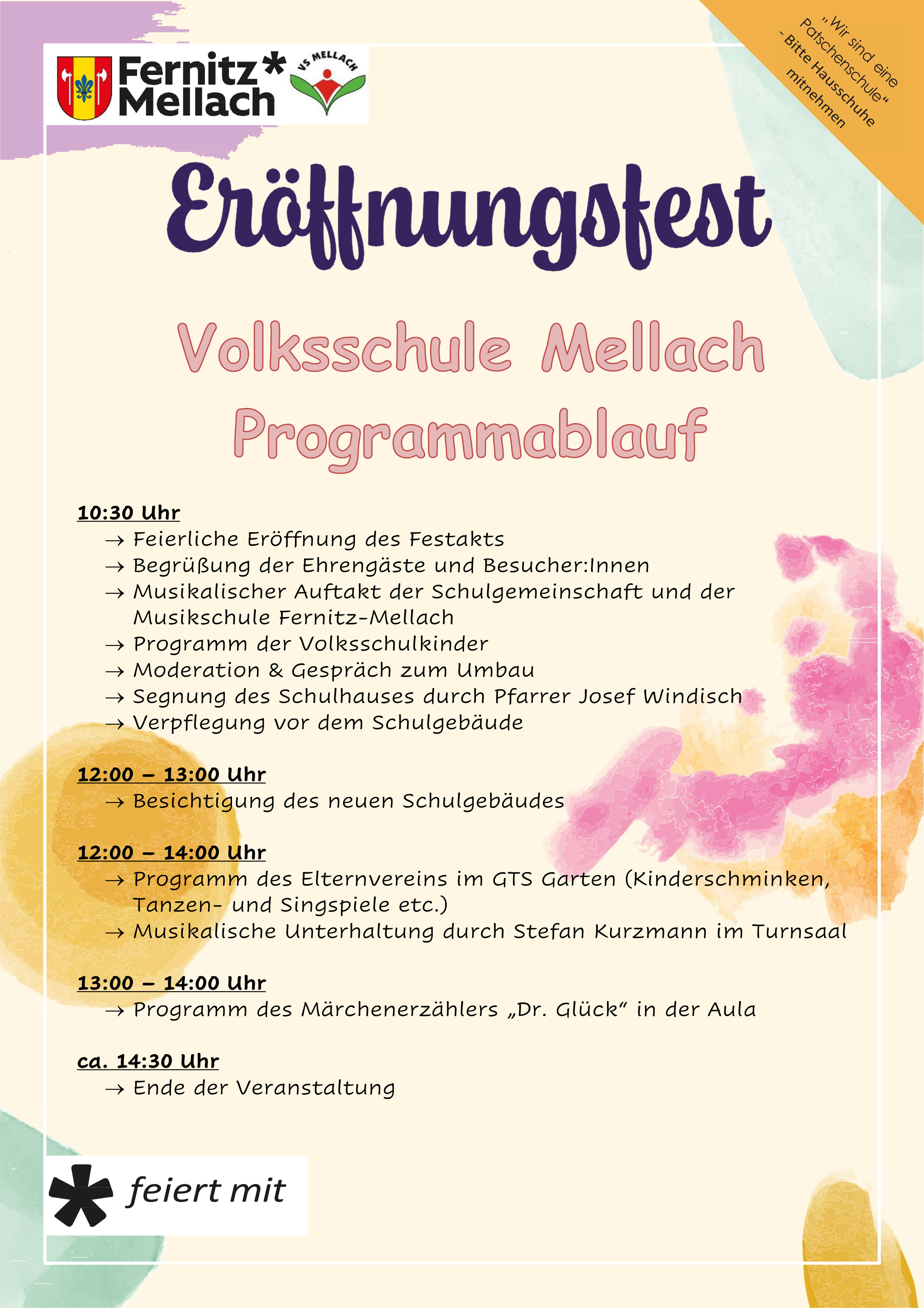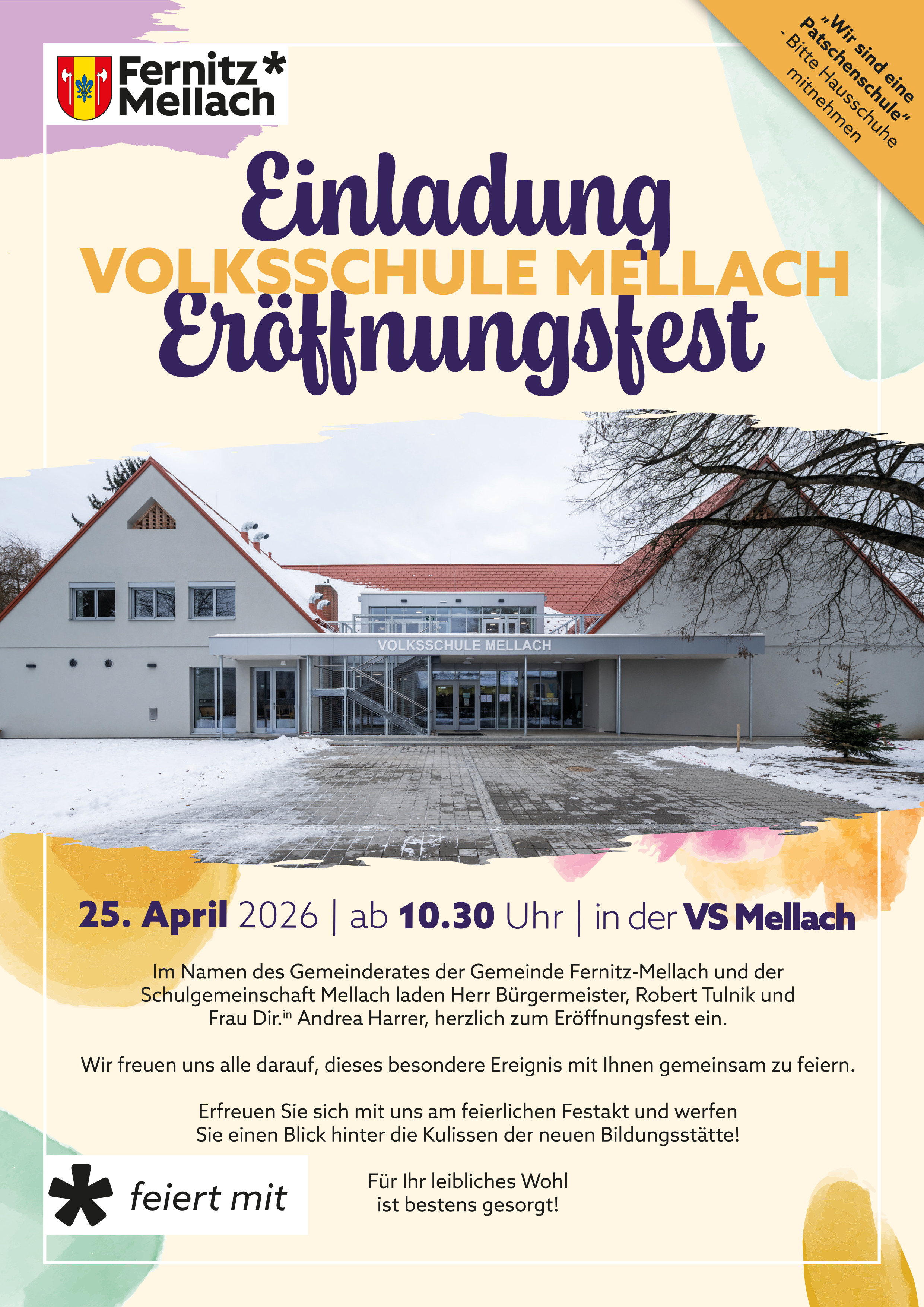 Im Namen des Gemeinderates der Gemeinde Fernitz-Mellach und der Schulgemeinschaft Mellach ladet Herr Bürgermeister, Robert Tulnik und Frau Direktorin Andrea Harrer, herzlich zum Eröffnungsfest ein.